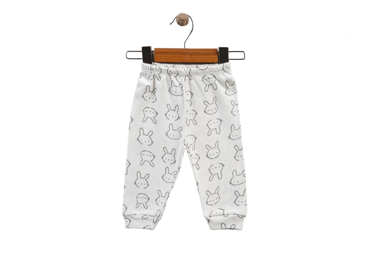 Бебешки дълъг панталон с дребен принт зайче по цялата повърхност.Еластична талия за удобно прилягане.Еластични маншети на глезените.Без подплата.