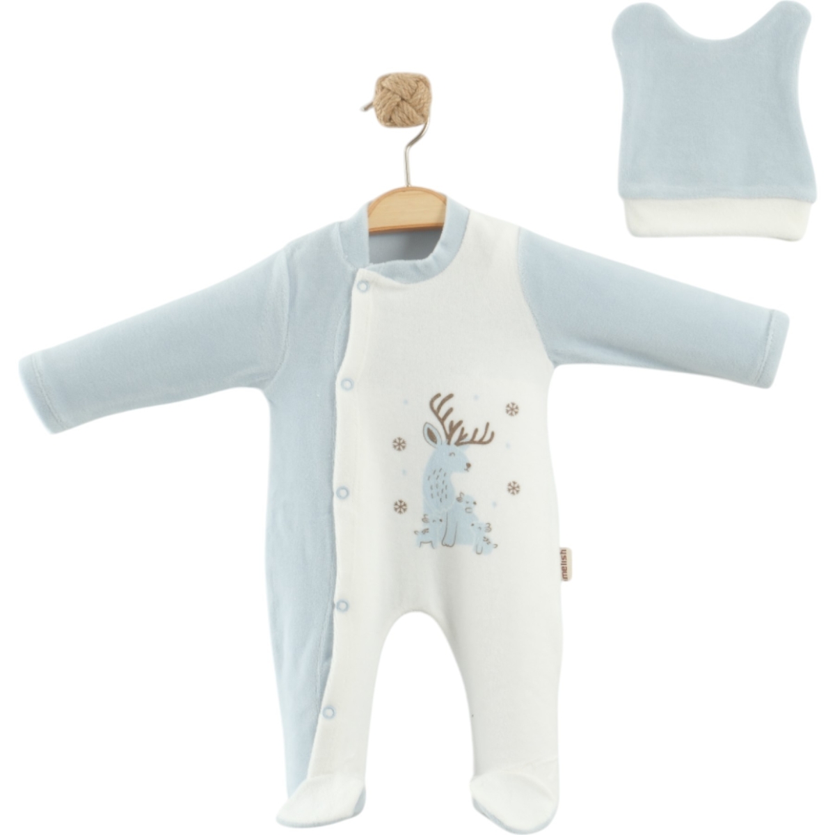 Бебешки плюшен гащеризон с предно странично тик так закопчаване,красива щампа еленче, обло деколте и шапчица към него
