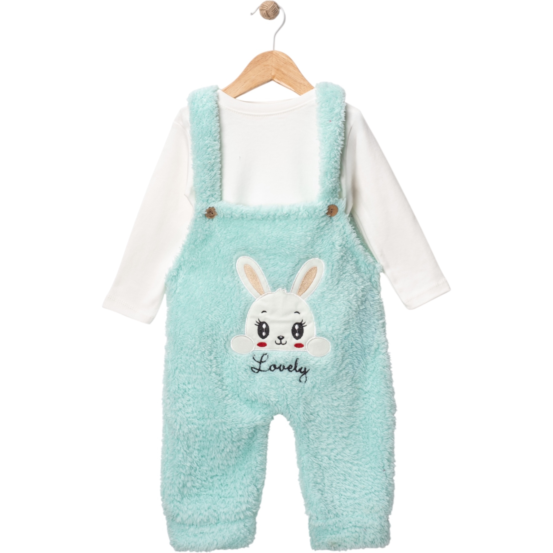 Бебешки плюшен комплект от плюшен гащеризон с красива апликация бяло Зайче и надпис „Lovely“и бяла изчистна блуза с дълъг ръкав и обло деколте.Комплект от две части.