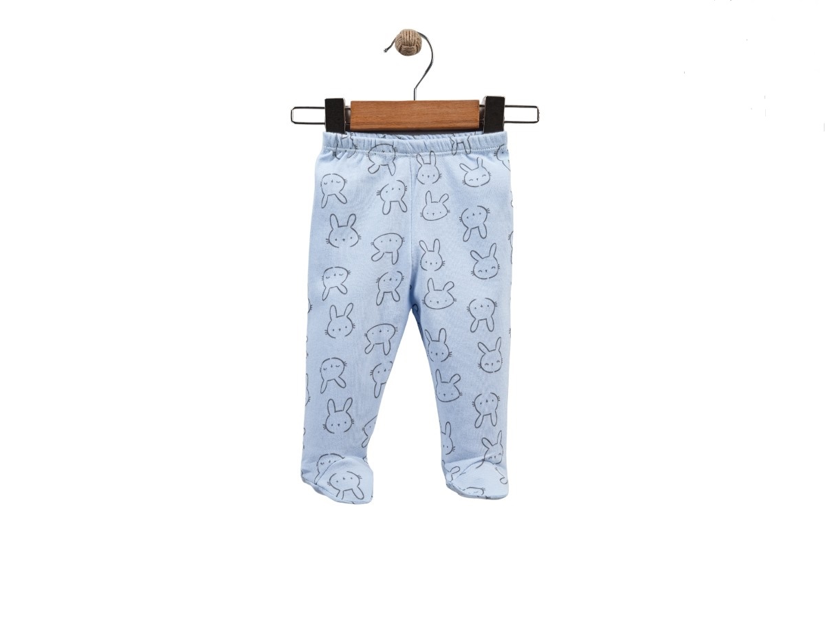 Бебешки ританки в нежен син цвят с принт зайчета. Дизайна е с еластична талия за по голямо удобство. Памук