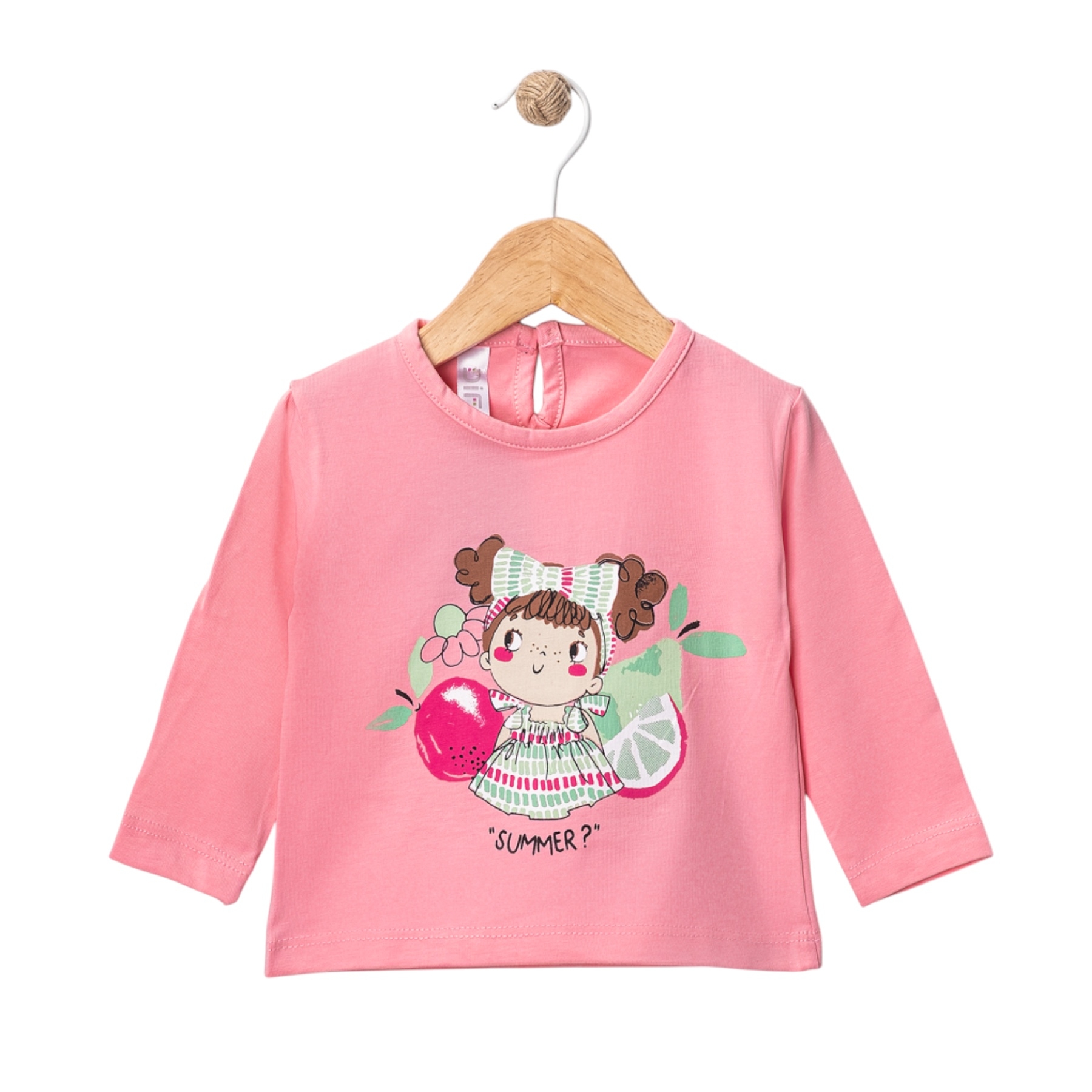 Детска блузка с дълъг ръкав, с принт малко момиченце с плодове и надпис „Summer“, с овално деколте и задно закопчаване.