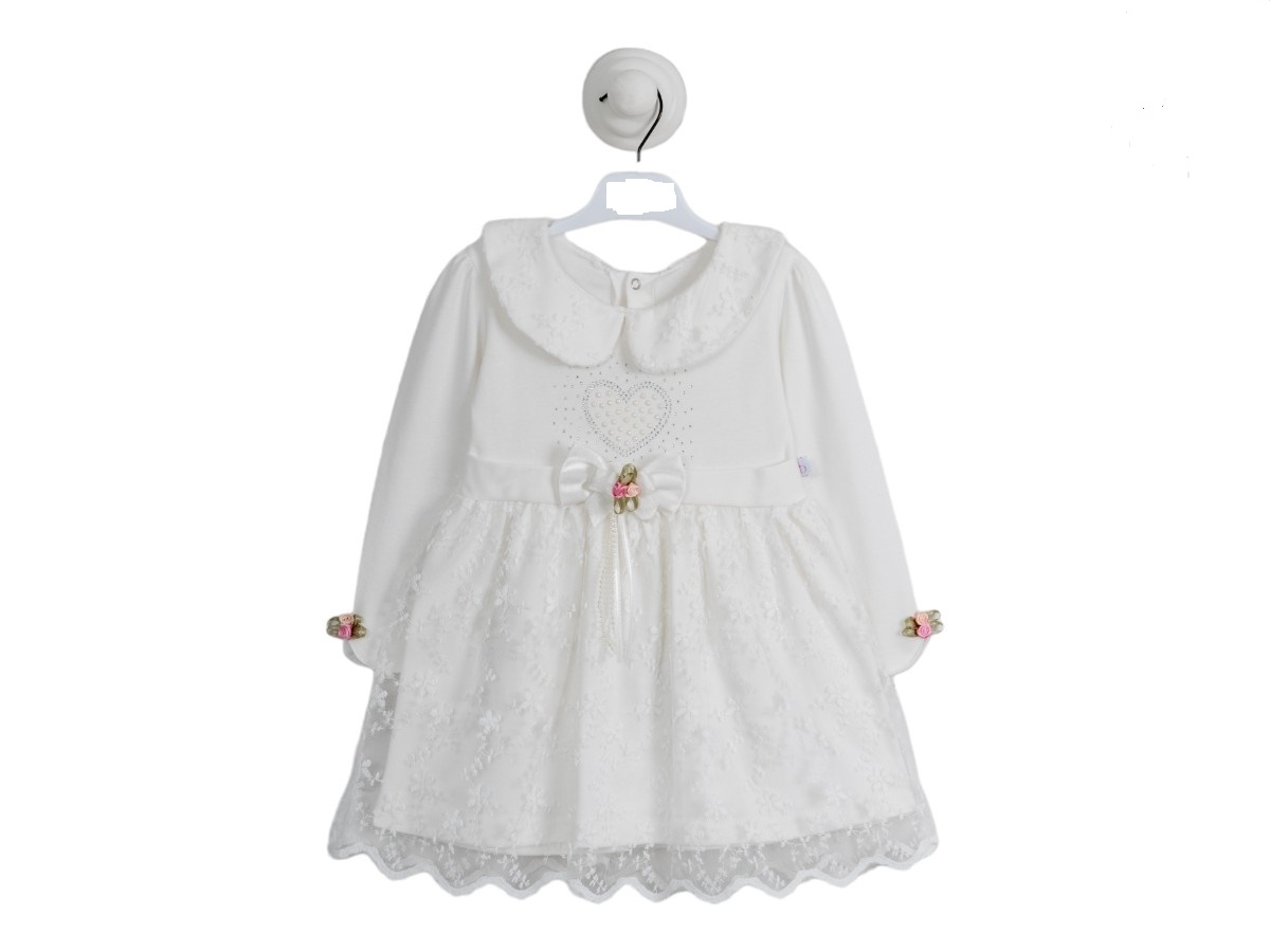 Бяла перлена рокля с якичка, бродирано сърце в бяло, деко панделка и 2 броя деко цветя на ръкавите, разкроен красив модел за всеки повод
