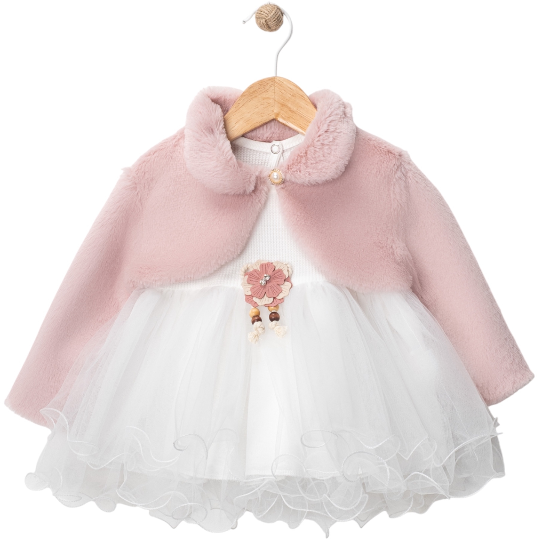 Детски официален комплект от две части. Пухкаво болеро в цвят „пепел от рози“, с яка и закопчаване в горната част. Официална бяла рокля, украсена с декоративно цвете в същия розов нюанс, и долна част тип „тюл“ с набори. Подходящ комплект за специални поводи – кръщенета, рожденни дни и т.н.