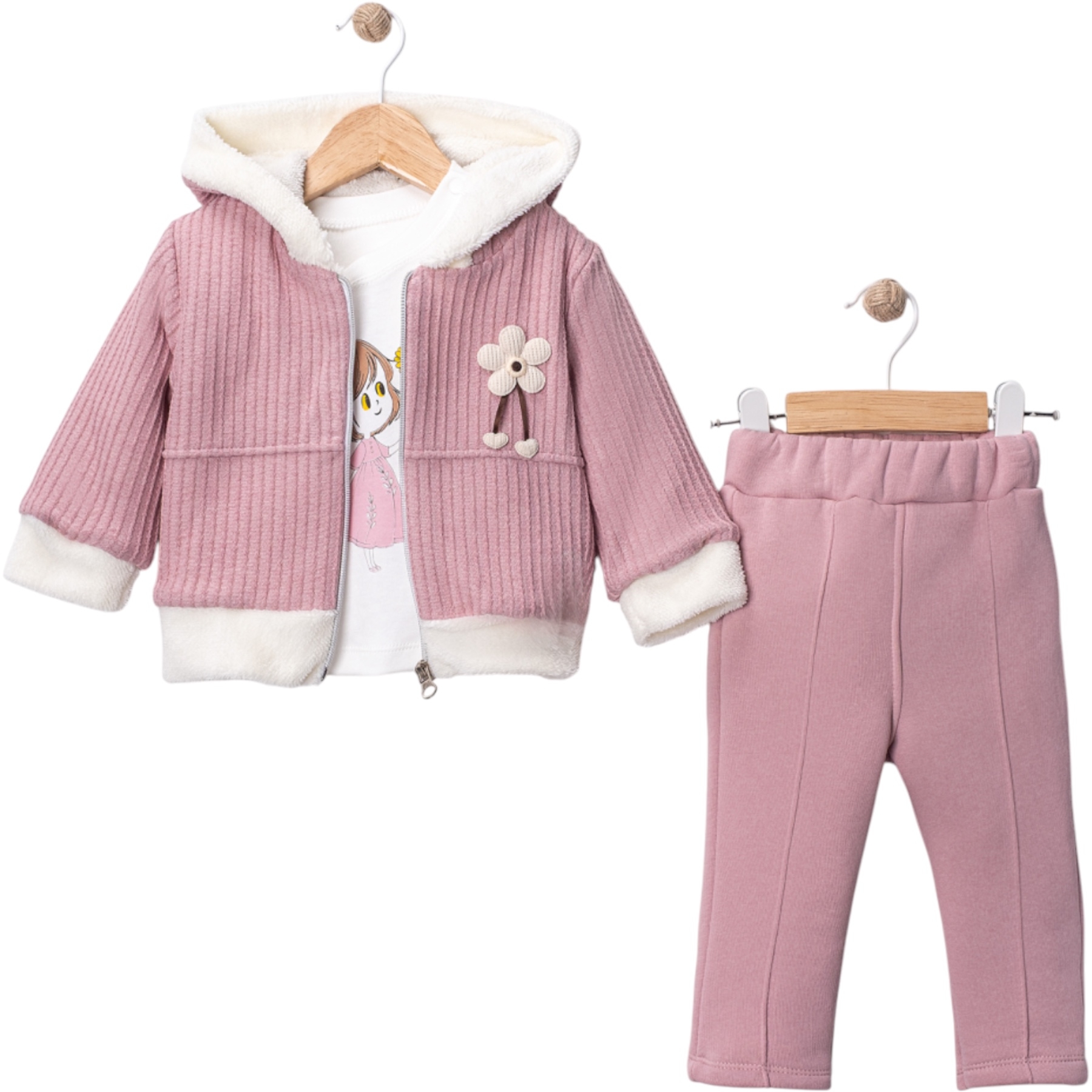 Детски комплект от три части, цвят лавандула. Изработен от мек рипсен материал, т.нар вафлено кадифе с топла бяла подплата от изкуствена агнешка вълна /шерпа/*. Якенцето е с пухкава апликация на цвете, качулка и цип за удобно обличане и събличане, бяла блуза с апликация и панталон с ластик на талията.100% памук.