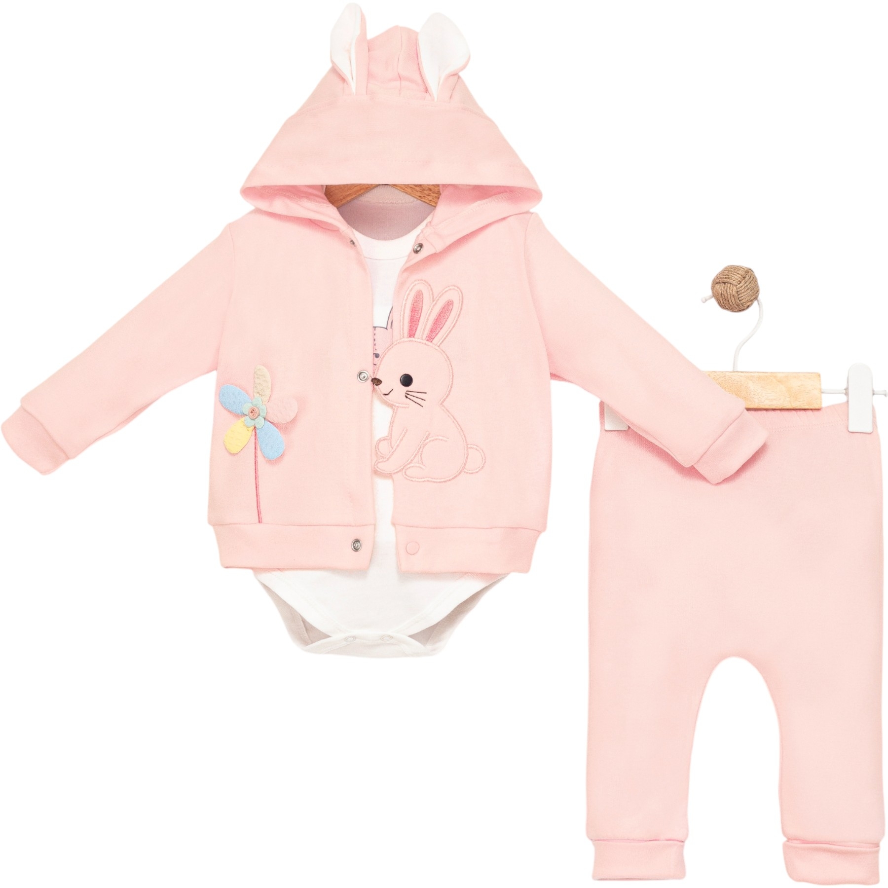 Коплект от три части в розово и бяло с надпис „Bunny Love“. Включва суитшър с качулка с 3D ушички, предно тик так закопчаване и апликация на цвете, памучно боди с щампа и панталонки.100% памук.