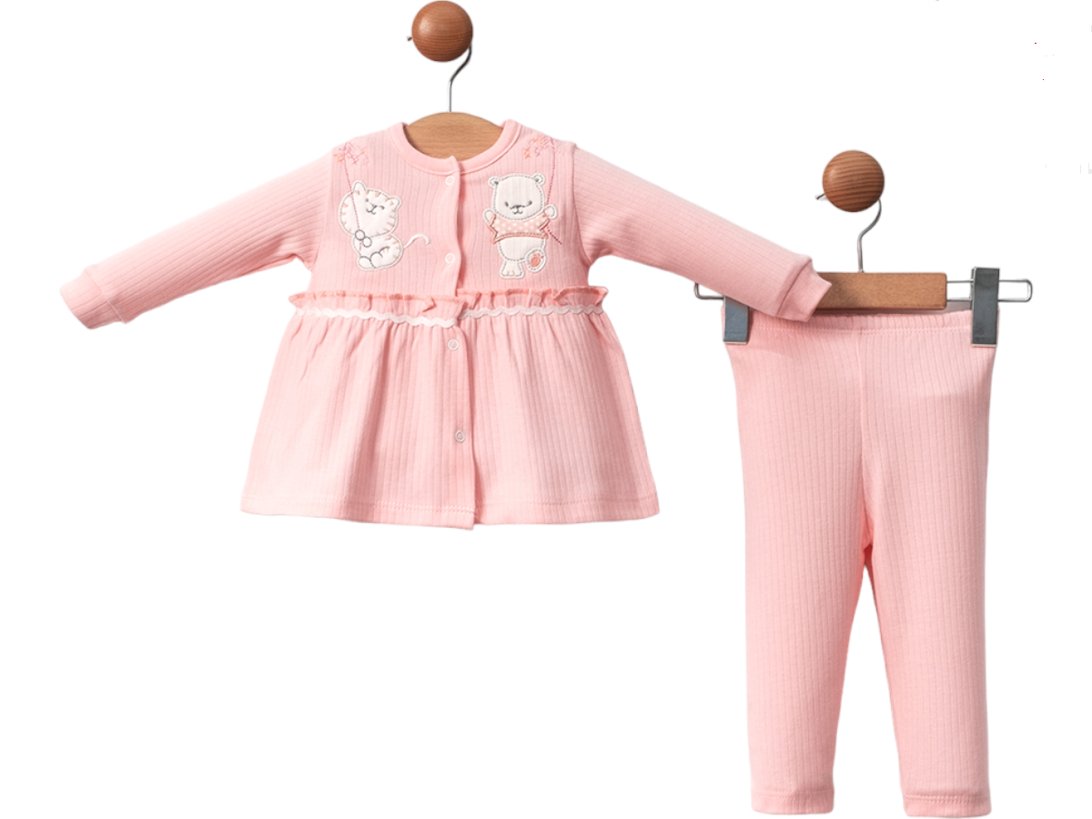 Детски комплект от две части. Включва туника с дълъг ръкав и декоративни апликации – мече и коте, предно тик так закопчаване и карсиви воали, съчетана с панталон с рипсена текстура.