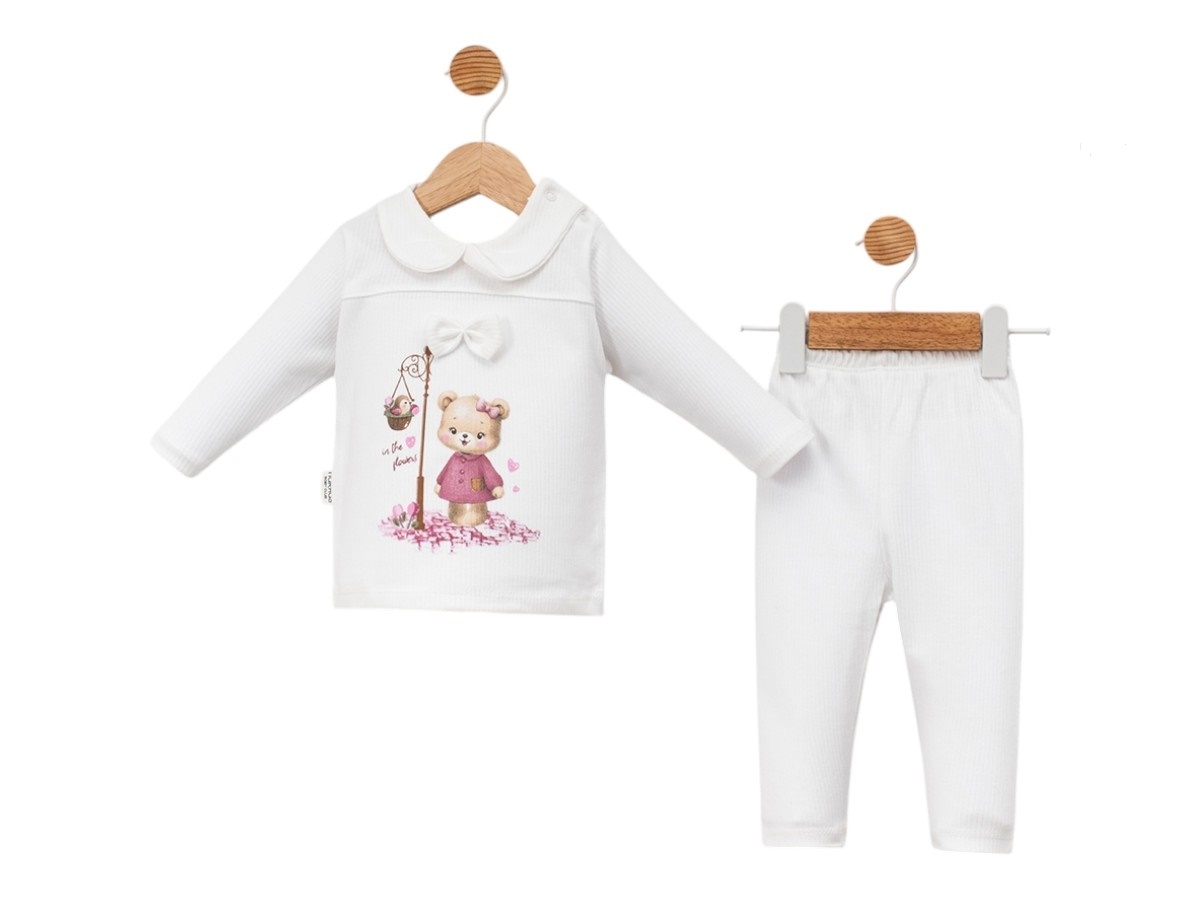 Бебешки комплект от две части, включва блуза с дълъг ръкав, яка тип „Питър Пан“, панделка и щампа на мече с птичка и бял панталон с еластична талия.
