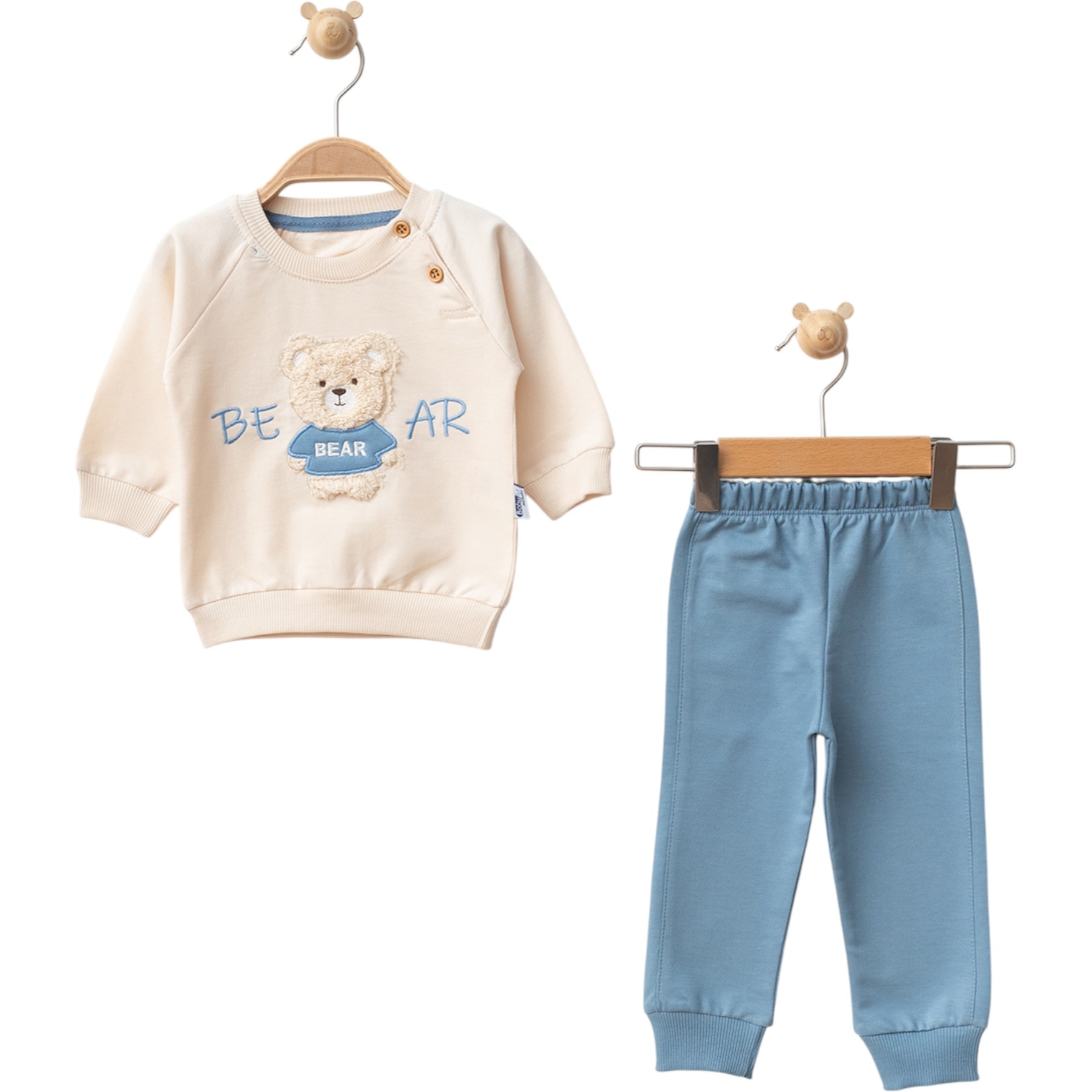 Детски комплект от две части. Включва блуза с дълъг ръкав, красива пухкава апликация мече и надпис „BEAR“, два броя дървени копчета на рамото за по -лесно обличане е спортен панталон, тип анцуг с еластична талия и маншети на крачолите за комфорт.