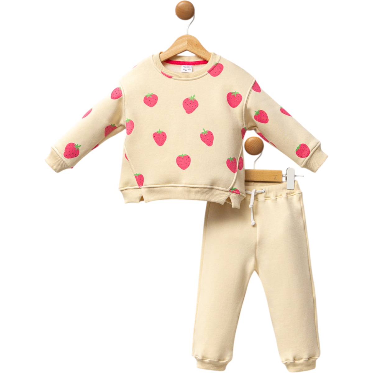 Детски комплект от две части /ватиран/. Включва блузка с обло деколте с десен на ягодки и бежов панталон тип анцуг.