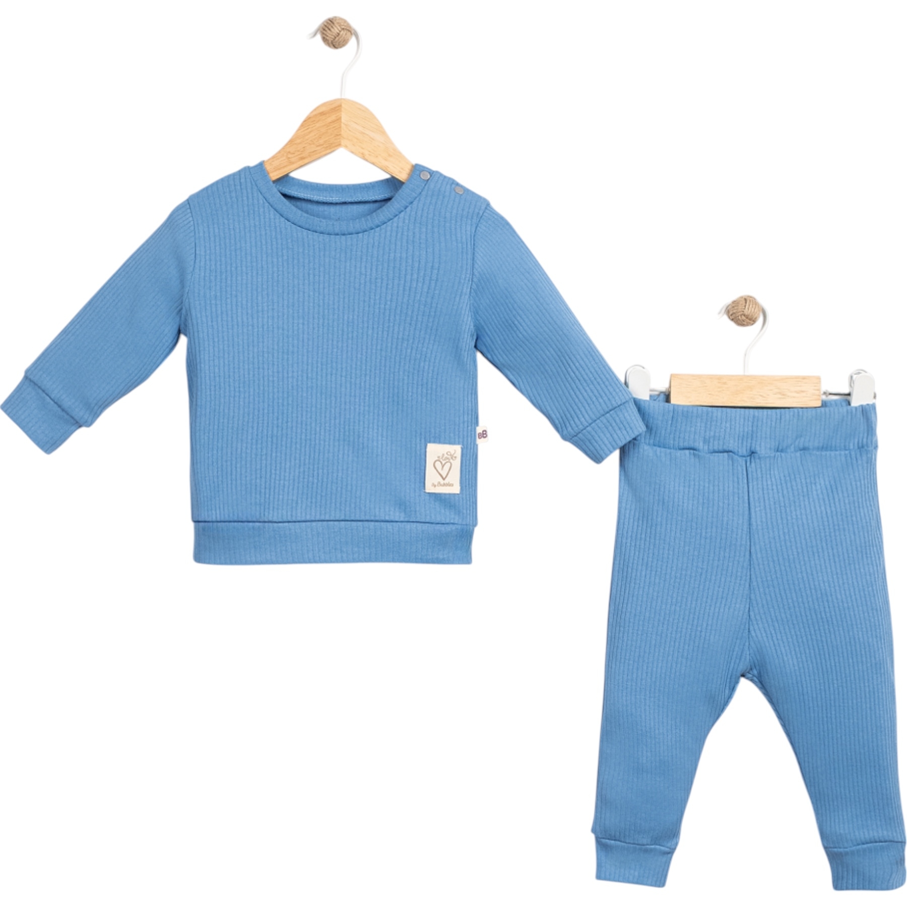 Детски комплект от две части, рипсиран, изчистен модел в синьо. Включва блуза с дълъг ръкав и панталон с ластик.