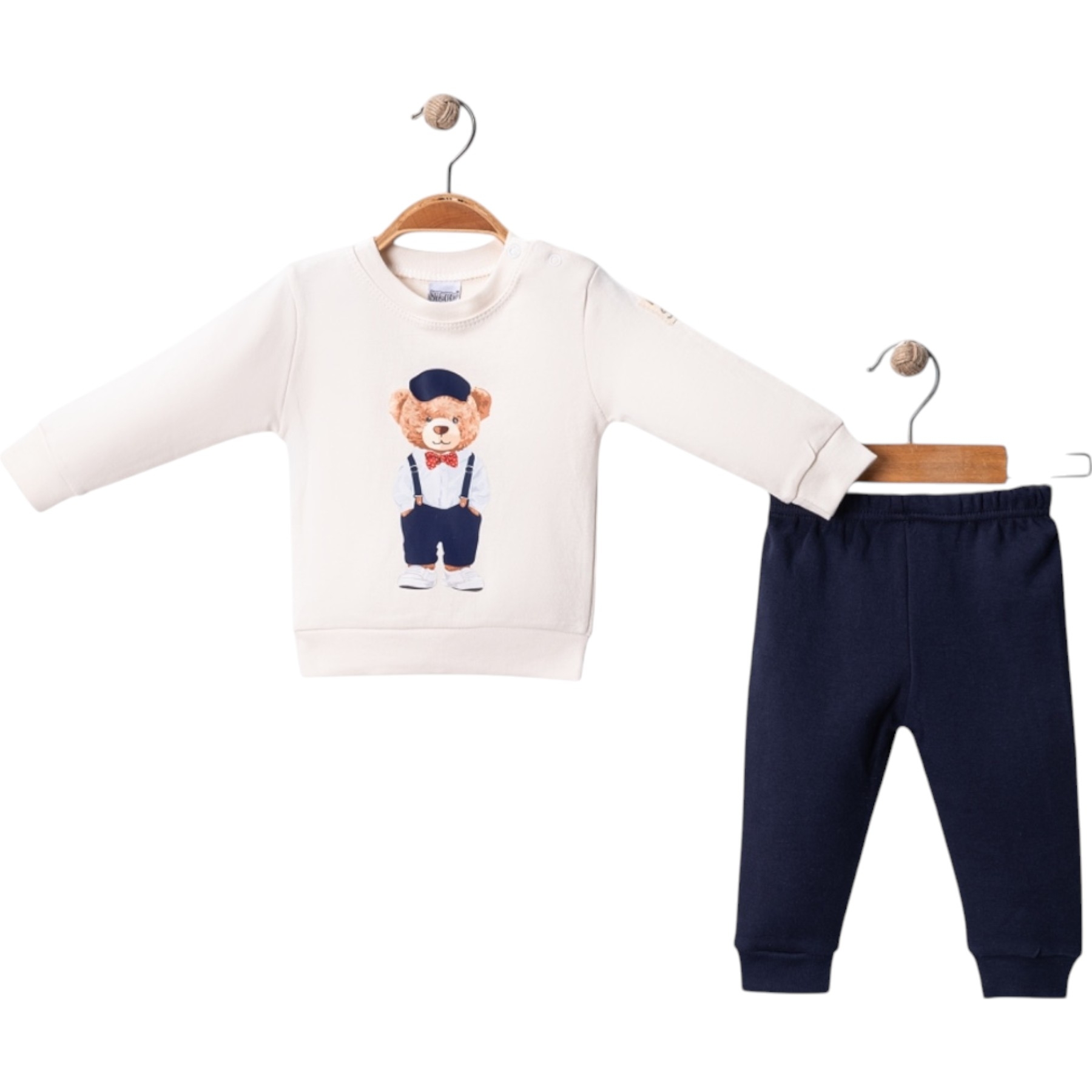 Детски комплект две части – бяла блузка с дълъг с принт мече с ръце в джобовете и спортен панталон в тъмно синьо