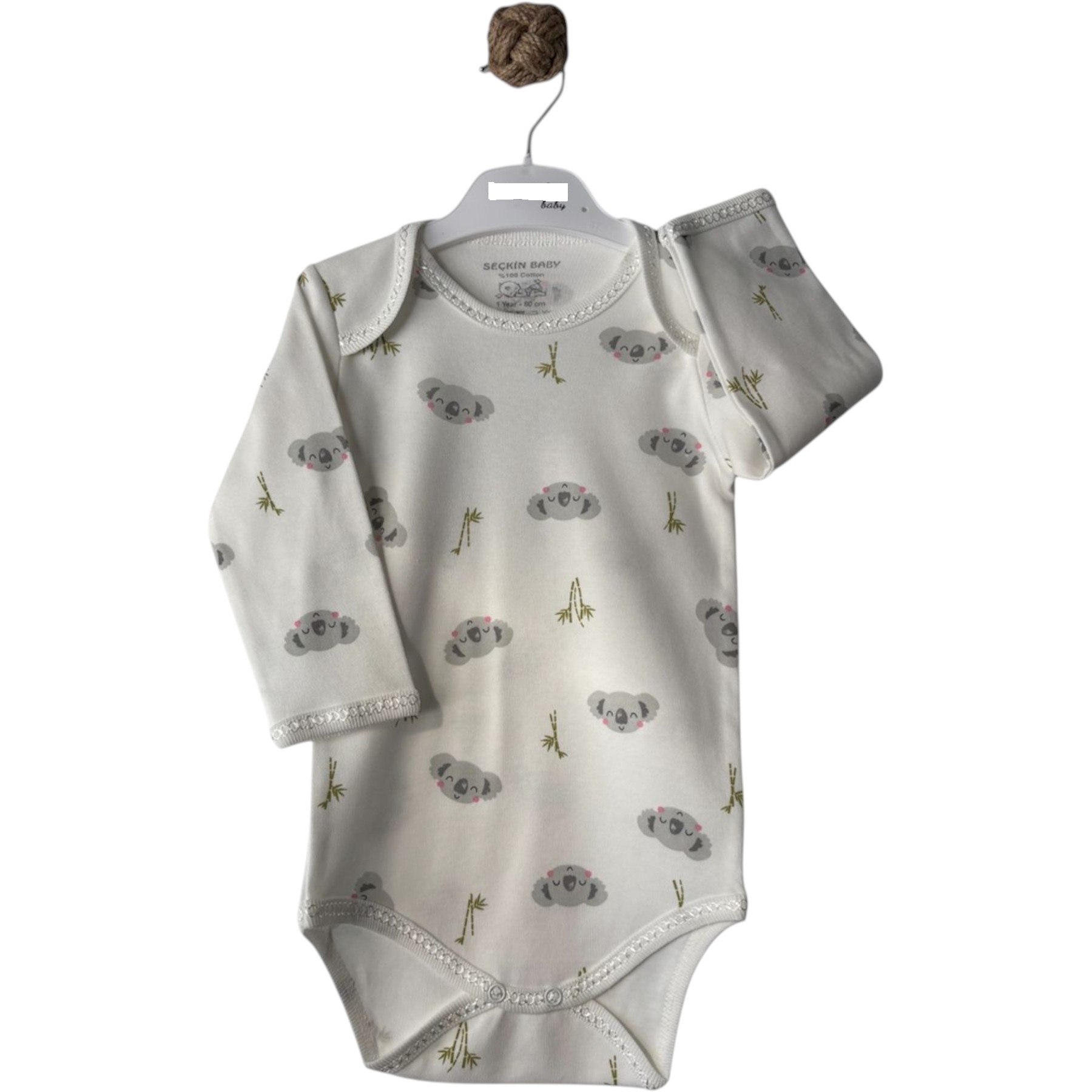Бебешко памучно боди в бяло с дълъг ръкав, кантирано деколте и долно тик так закопчаване, с принт на коали