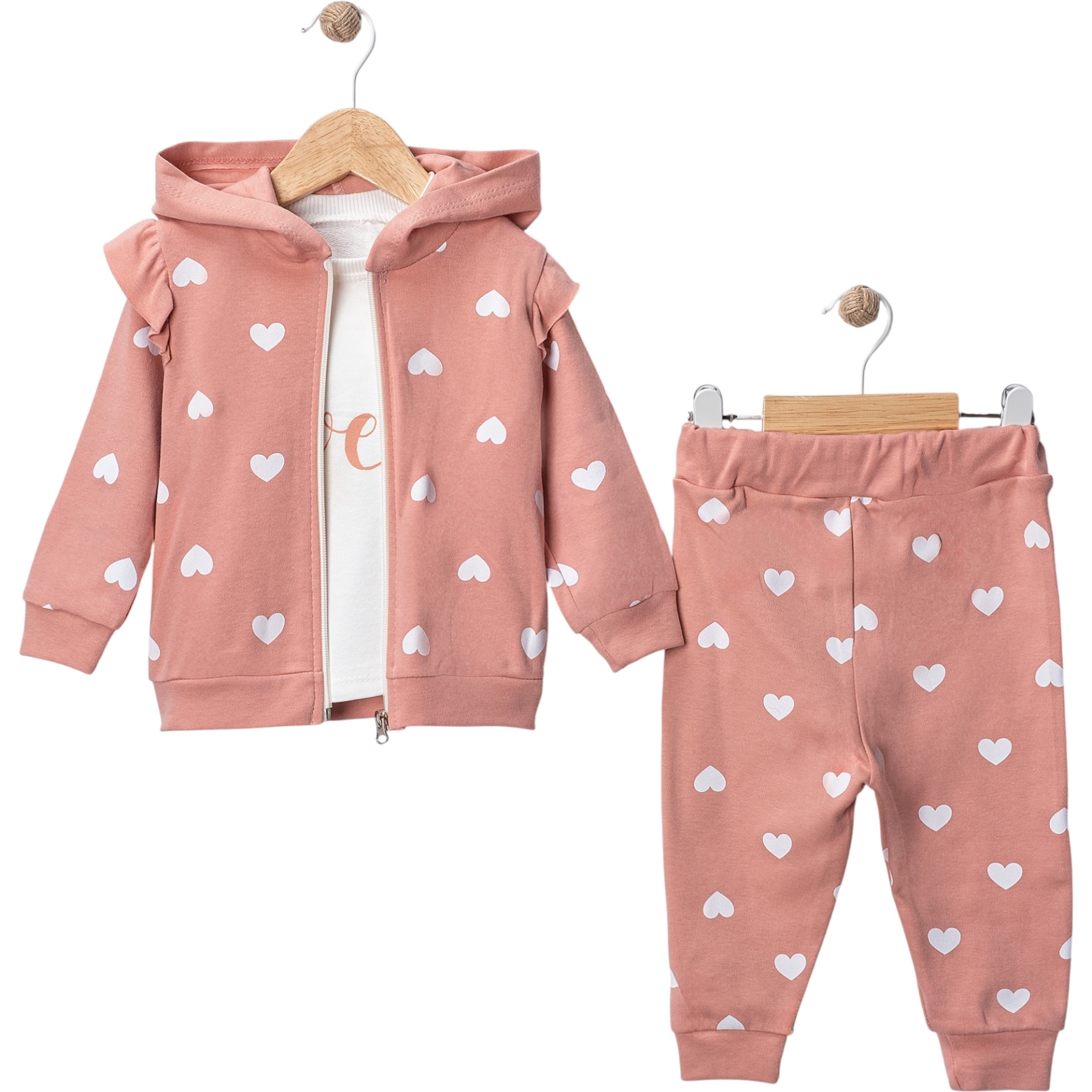 Детски комплект от три части момче. Състои се от розов анцуг от три части с десен на бели сърца.Комплектът включва суитшърт с качулка и цип, спортно долнище /анцуг/ и памучна блуза с щампа. 100% памук